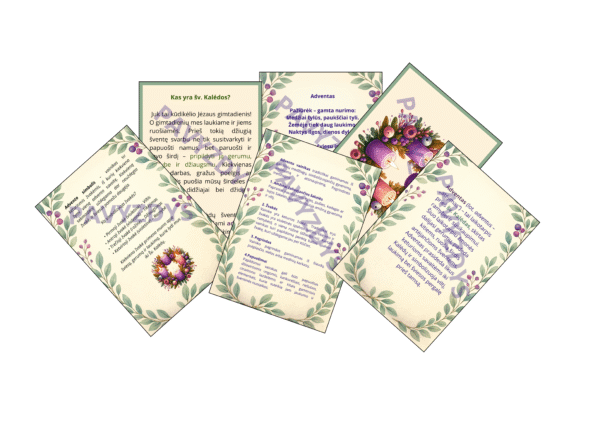 Rinkinyje 6 A4 formato lapai (PDF): trumpas advento pristatymas, pagrindiniai simboliai ir stendui skirtas Sigitos Ramanauskienės eilėraštis „Adventas“.