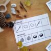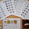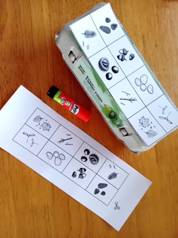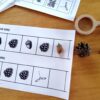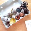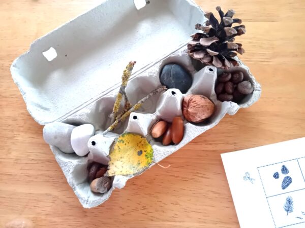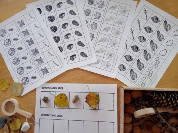 Gamtos lobių paieškos šablonai – specialios lentelės, kurias galima iškirpti ir priklijuoti ant tuščių kiaušinių dėžučių. Į kiekvieną langelį vaikai surenka nurodytą gamtos „lobį“: akmenuką, kankorėžį, giliuką, kaštoną, pagaliuką, lapą ar spygliuką.