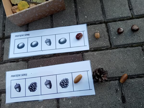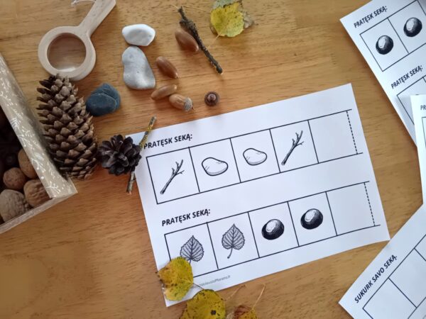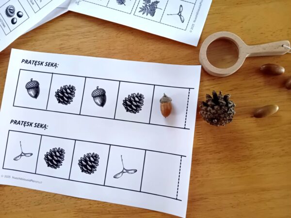 Sekų dėliojimo užduotys „Pratęsk seką“ – specialios lentelės, kuriose vaikai turi tęsti pradėtą seką (pvz., gilė – kankorėžis – gilė…). Jas galima naudoti tiek klasėje ar grupėje, tiek lauke, derinant su tikrais gamtos objektais.