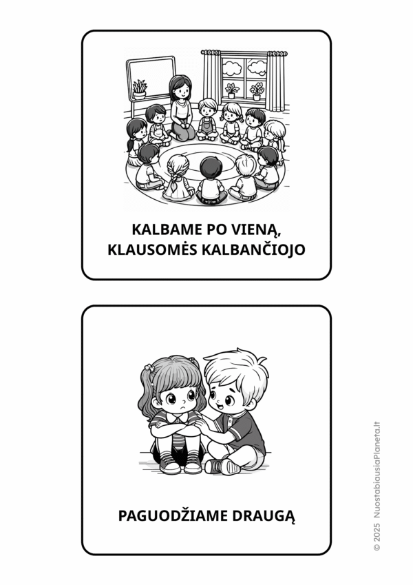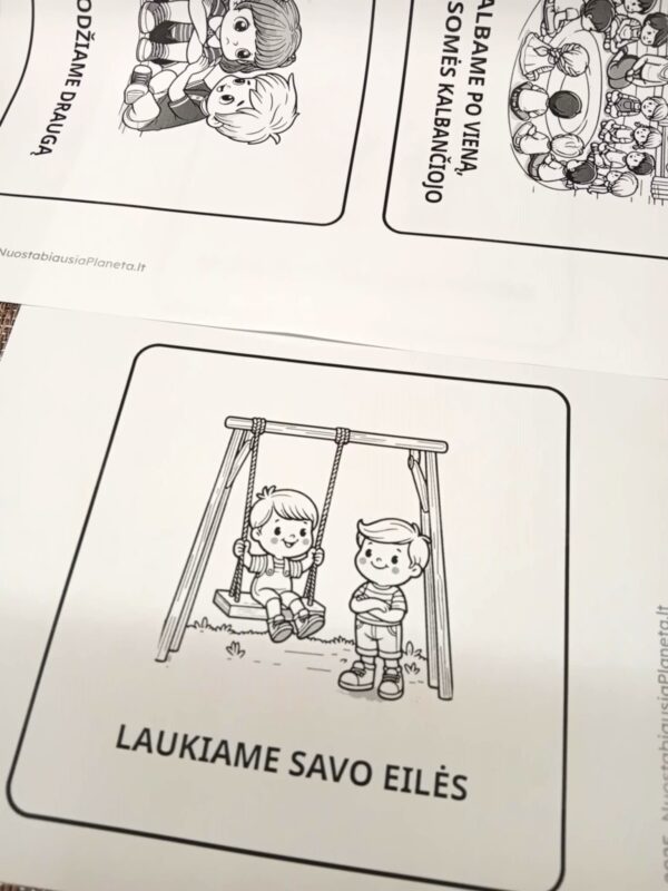 Galbūt vaikai gali nuspalvinti susitarimų iliustracijas, suklijuoti jas ant didelio lapo. Galbūt kiekvienas vaikas gali mažu lipduku pažymėti tą susitarimą, kuris JAM atrodo pats svarbiausias – taip vaikai nejučia bus paskatinti įsiklausyti, įsigilintį į kiekvieno susitarimo prasmę.