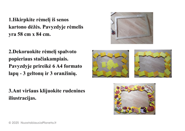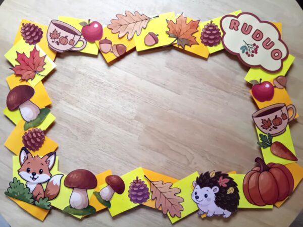 11 A4 formato lapų su paruoštomis spausdinti iliustracijomis: užrašai “RUDUO” “RUDENĖLIO ŠVENTĖ”, lapai, gilės, baravykai, ežiukas, kankorėžiai, moliūgai ir kiti dekoratyvūs elementai. Atsispausdinkite, iškirpkite ir papuoškite rėmelį iš kartono – tai bus puiki dekoracija (nuotraukoms) mokykloje ar darželyje!