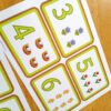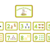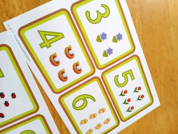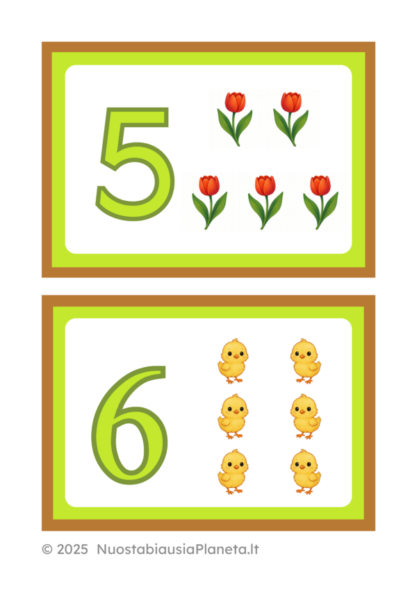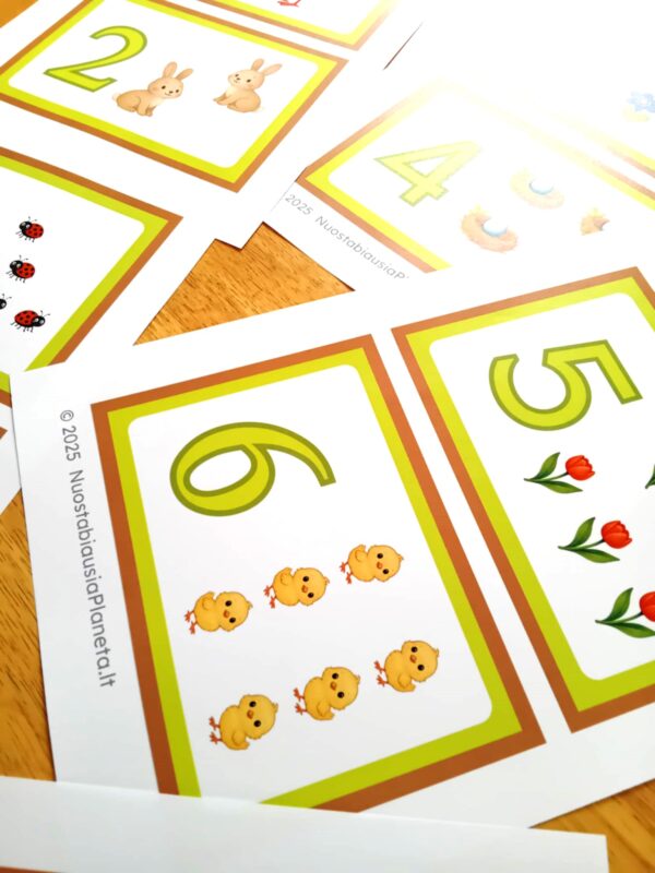 Mažos kortelės – 3 A4 formato lapai su keturiomis kortelėmis kiekviename (skaičiai nuo 1 iki 10 ir didesnė titulinė kortelė).