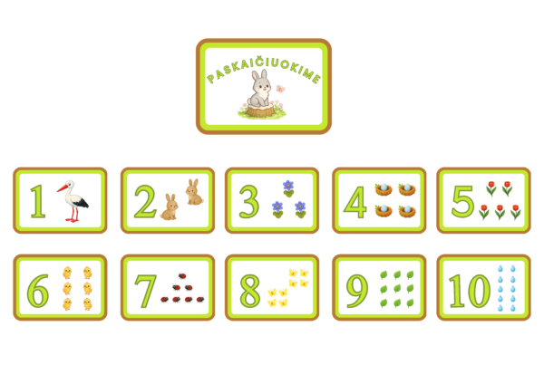 Skaičiai 1–10 su pavasariškais paveikslėliais „Paskaičiuokime!“